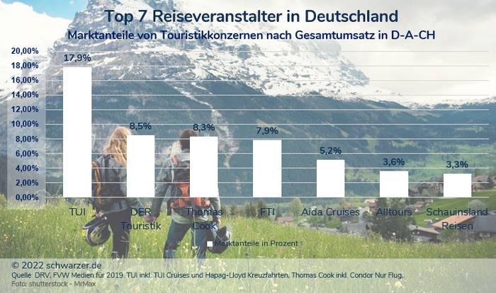Infografik: die sieben größten Reiseveranstalter, die Top 7 der Top 10 in Deutschland, gemessen an ihrem Gesamtumsatz im Jahr 2019. (Foto: shutterstock – MrMax)