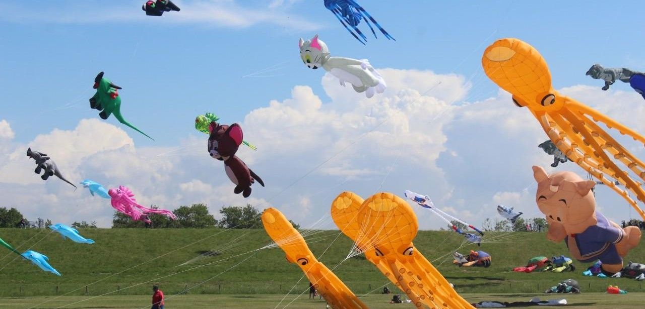 Bunte Dracheninstallationen tanzen über Nordseehimmel bei maritimer, einmaliger Festivalatmosphäre